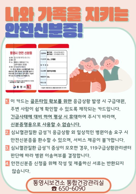 통영시보건소는 2020년부터 심뇌혈관질환자를 대상으로 개인별 질병 정보가 기록된 안전신분증을 발급해 현재까지 총 468명이 이 서비스를 이용했다.