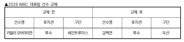[시사토픽뉴스]KBO 전력강화위원회는 부상으로 인해 WBC 참가가 어려워진 세인트루이스 라일리 오브라이언을 대체할 선수로 두산 김택연을 확정하고 WBC 조직위에 선수 교체 승인을 요청했다.