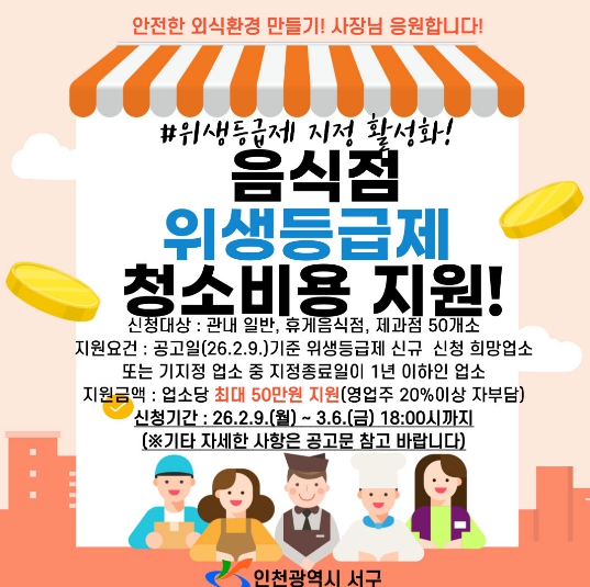 ![]() 인천 서구, 음식점 위생등급제 ‘청소비 지원’으로 문턱 낮춘다 |