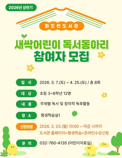 참가자 모집은 23일 오전 10시부터 화도진도서관 누리집에서 선착순 진행되며, 자세한 사항은 화도진도서관 누리집을 확인하거나 어린이자료실로 문의하면 된다.