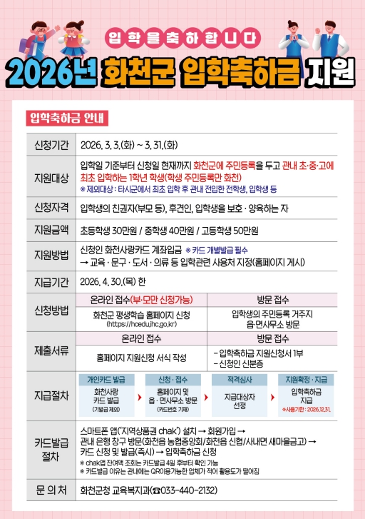 ![]() 2026년 화천군 입학축하금 지원 안내문 |