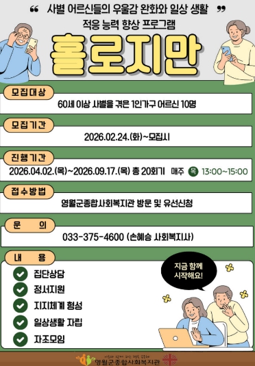영월군종합사회복지관은 “사별 이후 혼자 생활하며 심리적 어려움을 겪는 어르신들이 지역사회 안에서 다시 힘을 얻고 건강한 일상을 이어갈 수 있도록 적극 지원하겠다”며 지역 주민의 관심과 참여를 당부했다.