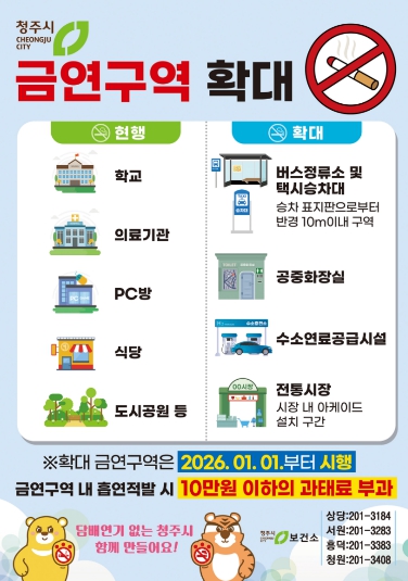 시는 공공장소 내 간접흡연 피해를 최소화하기 위해 ‘청주시 금연구역 지정 및 간접흡연 피해방지 조례’를 개정하고 올해 1월부터 금연구역을 확대했다.