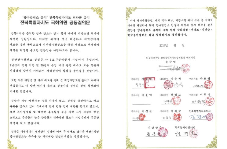 진안군 관계자는 “양수발전소 유치는 진안군을 넘어 전북 전체의 미래 경쟁력과 직결된 과제”라며 “전북특별자치도와 지역 국회의원들이 함께 뜻을 모아 공동서명으로 이어졌다는 것은 전북이 하나의 팀으로 움직이고 있다는 상징적인 의미를 갖는다”고 밝혔다.