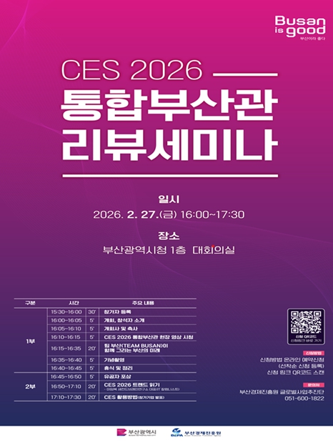 이날 세미나는 ▲CES 2026 통합부산관 현장 영상 상영 ▲'팀 부산이 함께 그리는 부산의 미래' 간담회 ▲'CES 2026 트렌드 읽기' 전문가 강연 ▲통합부산관 참가기업 성과 발표순으로 진행된다.