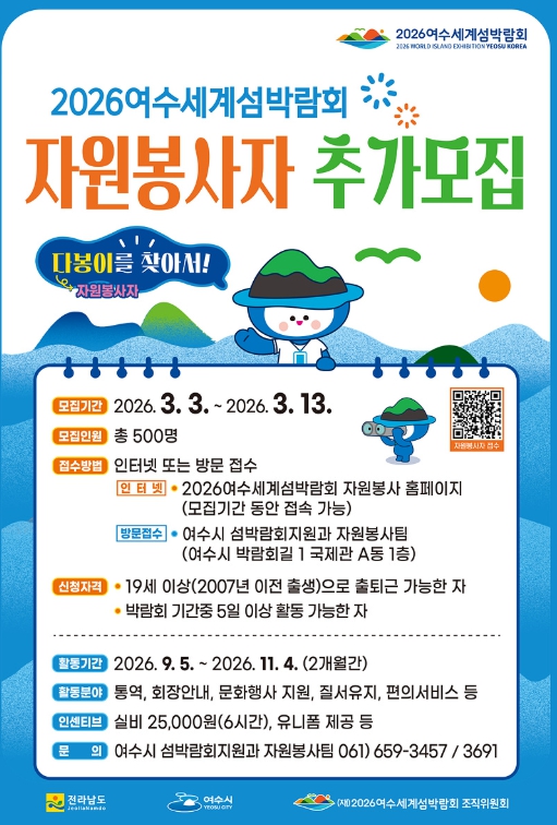 ![]() 2026여수세계섬박람회 자원봉사자 추가모집 포스터 |