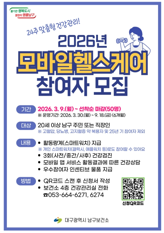 모집 대상은 20세 이상 스마트폰을 소지한 남구 주민 또는 관내 직장인으로 혈압, 공복혈당, 허리둘레, 중성지방, HDL-콜레스테롤 등 건강 위험 요인이 많은 대상자가 우선 선정되며, 고혈압·당뇨·고지혈증을 진단받고 약물을 복용 중이거나, 2025년 모바일 헬스케어 사업에 참여했던 대상자는 신청할 수 없다.