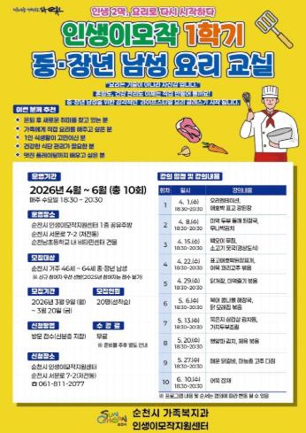 ![]() 순천시 인생이모작지원센터, 중·장년 남성 요리 교실 수강생 모집 |