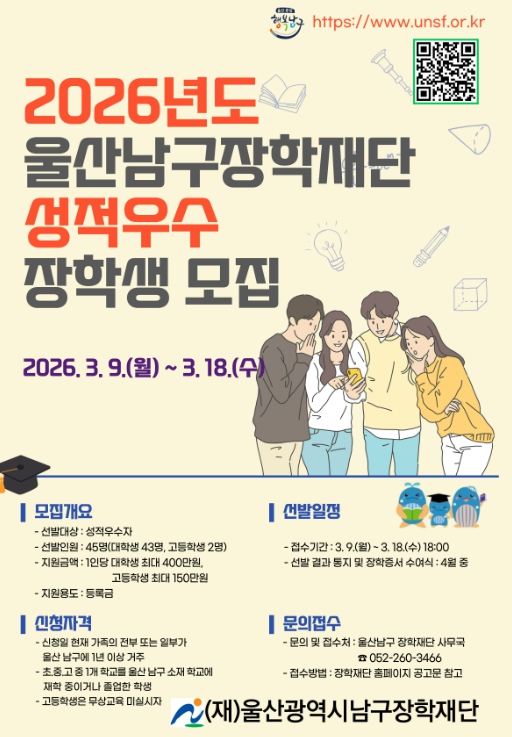 최종 장학생은 재단 이사회 심의를 거쳐 4월 중에 발표할 예정으로 장학금 신청과 관련한 자세한 사항은 울산남구장학재단 사무국으로 문의하면 된다.