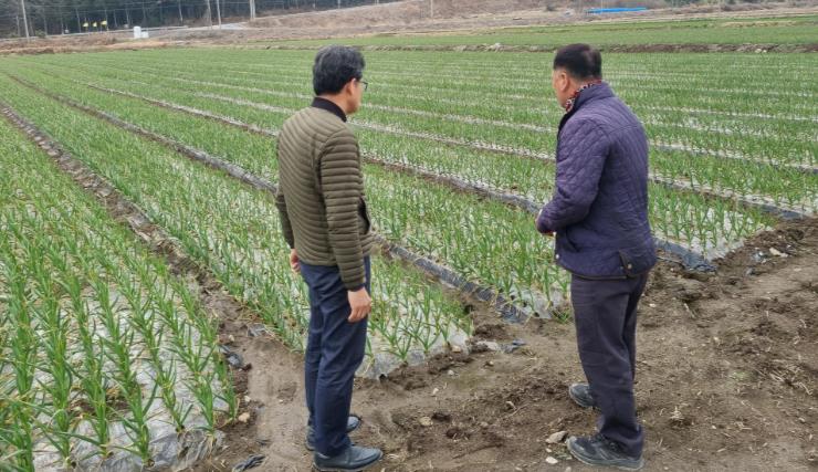 ![]() 강진군 관계자가 강진관내 마늘농장을 방문했다. |