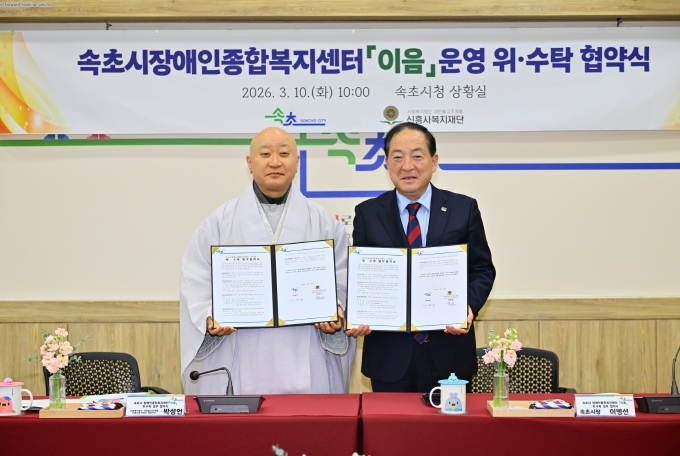 이번 협약은 2026년 3월 말부터 지역 장애인을 대상으로 상담, 재활, 문화·여가 프로그램 등 통합 재활서비스를 제공할 속초시 장애인종합복지센터 ‘이음’의 운영을 위해 마련됐다. 시는 운영 위수탁을 통해 전문성과 경영 노하우를 결합한 안정적인 복지서비스 제공 기반을 마련한다는 방침이다.