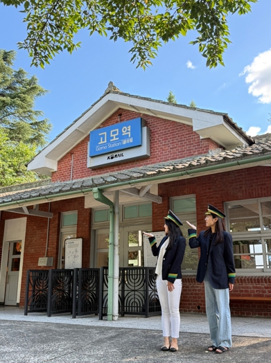 ![]() 관광객들이 고모역에서 역무원 체험을 하고 있다. |