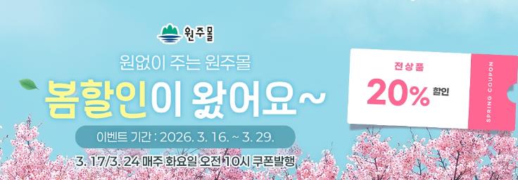 또한 소비자들이 합리적인 가격으로 제품을 구매할 수 있도록 할인 쿠폰 발급 이벤트도 함께 진행된다. 행사 기간 원주몰 회원을 대상으로 매주 화요일(3월 17일·24일) 오전 10시에 20% 할인 쿠폰이 발급된다.