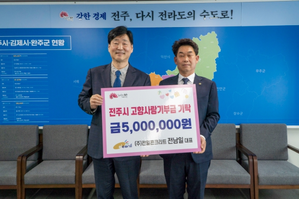전남일 ㈜전일콘크리트 대표는 20일 전주 부시장실을 방문해 마음의 고향인 전주를 응원하는 마음을 담은 고향사랑기부금 500만 원을 기부했다.