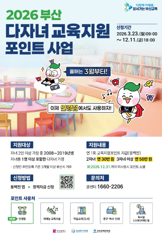 부산시교육청은 2024년부터 부산시와 공동으로 예산을 분담하여 다자녀 가정에 대한 교육지원포인트를 지급하고 있다.