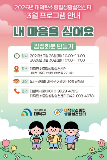 프로그램 참여 신청은 지역 5세부터 8세 어린이 10명을 대상으로 선착순으로 진행되며, 프로그램은 오전 10시부터 11시까지 대덕탄소중립생활실천센터에서 운영된다.