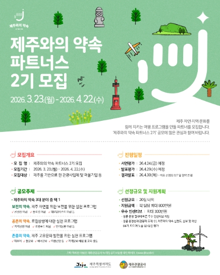 이와 관련, 제주관광공사 관계자는 “지난해 추진된 제주와의 약속 파트너스 1기에선 제주와의 약속 실천 사례 발굴을 위해 친환경 러닝 프로그램, 지역 상생 프로그램, 해녀 문화 확산 프로그램 등 다양한 프로그램이 운영된 바 있다”며 “이번 2기에도 많은 관심과 참여를 통해 제주와의 약속의 가치를 도민과 관광객에게 전파할 수 있길 바란다”고 전했다.
