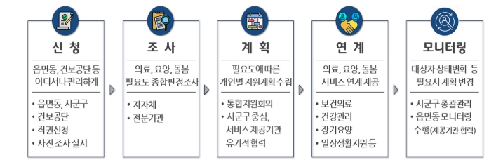 신청이 접수되면 읍면동에서 현장을 직접 방문해 돌봄 필요도를 조사하고 필요한 서비스를 연계하는 체계로 운영된다.