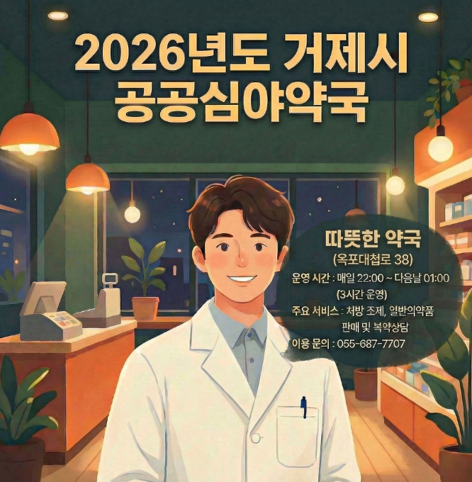 김영실 보건소장은 “공공심야약국이 늦은 밤 시민들에게 작은 위로가 되는 공간이 되길 바란다”며 “앞으로도 거제시약사회와 함께 더욱 촘촘한 보건의료 체계를 만들어 나가겠다”고 밝혔다.