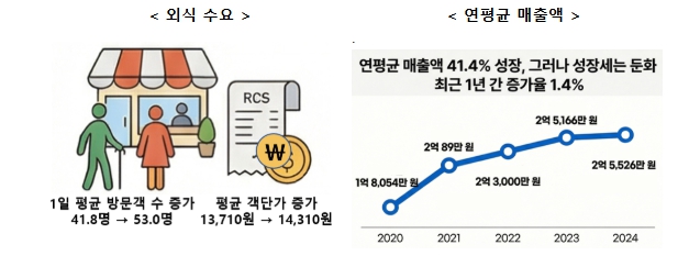 2024년 실적 기준 외식업체 당 연평균 매출액은 2억 5,526만 원으로, 2021년(1억 8,054만 원) 대비 무려 41.4%나 성장했다.