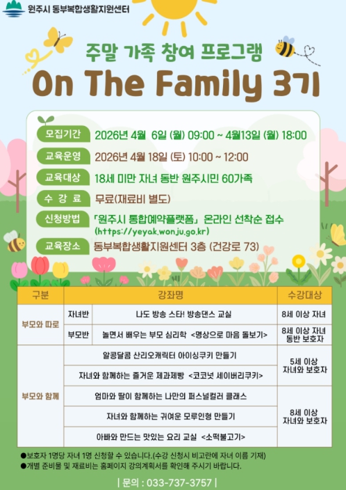모집 대상은 18세 이하 자녀를 동반한 원주시민 60가족이다. 수강료는 무료며, 재료비는 본인 부담이다.