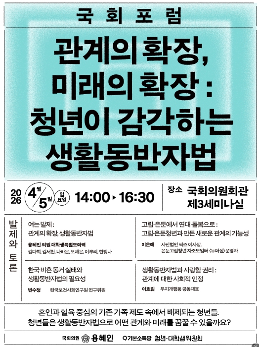 ![]() <관계의 확장, 미래의 확장 : 청년이 감각하는 생활동반자법> 국회포럼 포스터 |