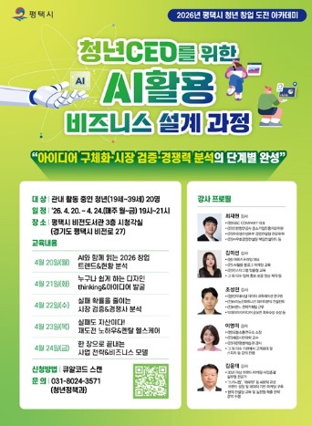 참가 대상은 평택시 관내에서 창업에 관심이 있는 만 19세부터 39세까지의 청년이며, 신청 기간은 4월 2일부터 17일까지 안내 이미지의 정보무늬(QR코드)를 통해 접수할 수 있다. 이번 교육 강좌에 대한 자세한 문의는 평택시청 청년정책과(031-8024-3571)로 하면 된다.