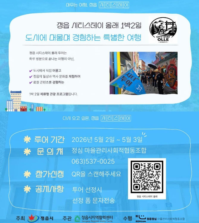 ‘정읍 시티스테이 올래’는 하루 방문으로 끝나는 여행이 아니라, 정읍 도심에 직접 머물며 지역의 일상과 역사 문화를 체험하고 지역 특화 자원을 풍성하게 경험하는 체류형 관광 프로그램이다.