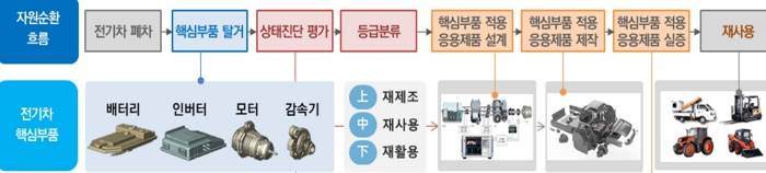 이번 사업은 단순 재활용을 넘어, 전기차 폐배터리를 중심으로 모터·감속기·인버터 등 핵심 구동부품까지 포함한 전주기 순환이용 체계를 구축하는 것이 핵심이다.
