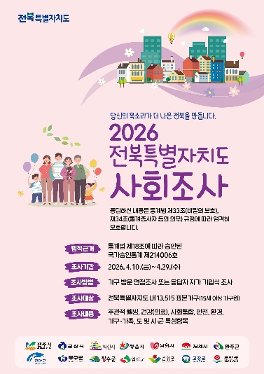 ‘순창군 사회조사’는 전북특별자치도가 주관하고 순창군이 매년 공동으로 추진하는 통계 조사로, 군민의 사회적 관심사와 주관적 의식 변화를 종합적으로 파악하기 위해 실시된다.