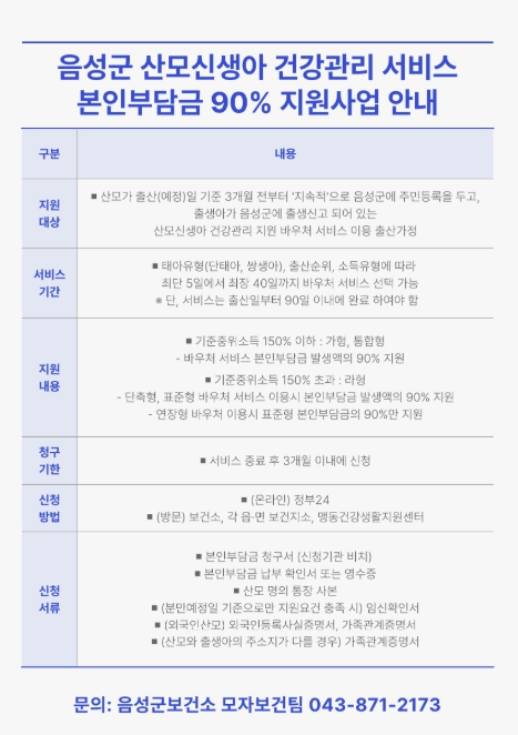 지원 대상은 산모가 출산(예정)일 기준 3개월 전부터 음성군 내에 주민등록을 두고, 신생아가 음성군에 출생신고 돼 산모·신생아 건강관리 서비스를 이용한 출산 가정이다.