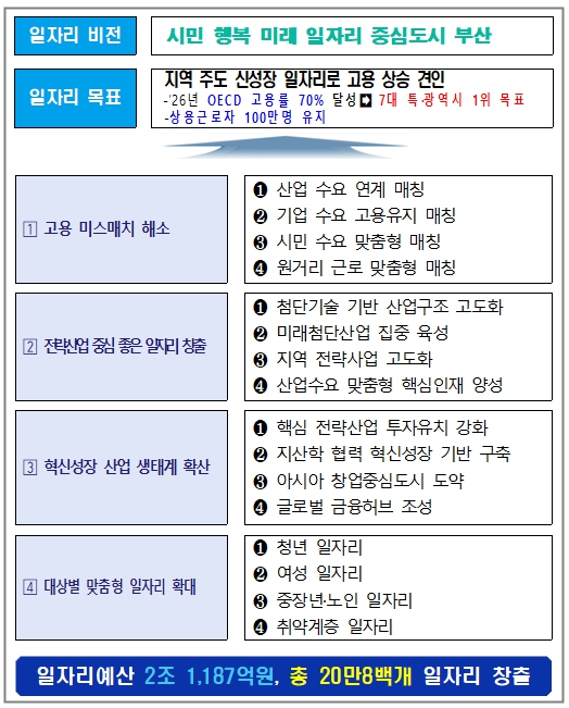 종합계획은 '시민행복 미래 일자리 중심도시 부산'을 비전으로 ▲고용 미스매치 해소 ▲전략산업 중심 좋은 일자리 창출 ▲혁신성장 산업 생태계 확산 ▲대상별 맞춤형 일자리 확대의 4대 전략 16개 실천 과제로 구성됐다.