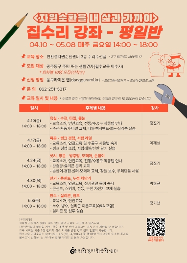 강좌는 누구나 참여할 수 있으며, 회차별 10명씩 선착순 모집한다. 참가비는 회차당 1만 원이다. 신청은 자원순환 앱 ‘동구라미 온’ 또는 누리집을 통해 가능하며, 홍보 포스터에 안내된 QR코드를 통해서도 접수할 수 있다. 자세한 문의는 친환경자원순환센터로 하면 된다.