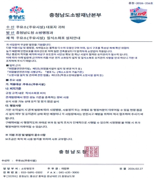 서산소방서는 소방시설 점검이나 안전교육 등 모든 행정 활동은 사전에 공식 공문이나 유선 안내를 통해 진행되며, 현장에서 물품 구매를 강요하거나 금전을 요구하는 경우는 절대 없다고 강조했다.