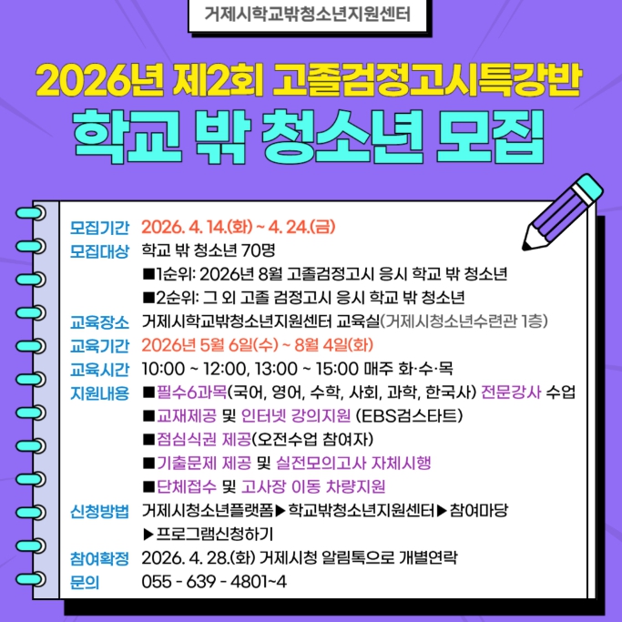 신청 방법은 거제시청소년플랫폼에서 온라인으로 접수하며, 거제시학교밖청소년지원센터 참여마당의 프로그램 신청에서 8월 검정고시특강반 모집을 선택하면 된다.