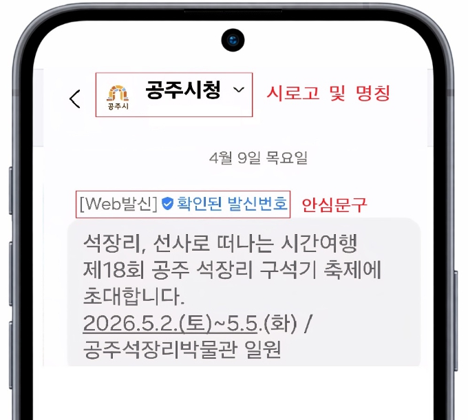 송무경 공주시장 권한대행은 “최근 공공기관을 사칭한 문자메시지로 인한 피해가 꾸준히 발생해 시민들의 불안이 커지고 있다”며 “안심마크 서비스를 통해 공주시에서 발송한 공식 문자임을 명확히 확인할 수 있게 함으로써, 사칭 피해를 줄이는 데 실질적인 도움이 될 것으로 기대한다”고 말했다.