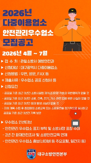 ![]() 대구소방, 2026년 안전관리 우수 다중이용업소 신청 접수 포스터 |