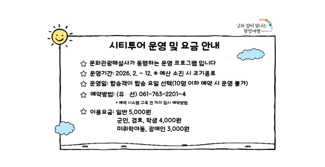 한편, 광양시티투어는 산업관광 코스를 비롯해 야경·힐링·역사 등 다양한 테마로 운영되며, 자세한 사항은 광양시 문화관광 누리집 ‘여행준비’의 ‘시티투어’ 코너에서 확인할 수 있다.