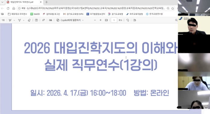 이번 연수는 파주 관내 고등학교 교사를 대상으로 진행하며, 4월 17일부터 6월 19일까지 총 3회에 걸쳐 온라인 쌍방향 연수로 진행된다. 교사들은 학기 중 바쁜 일정 속에서도 학생들의 미래를 위한 진학지도 역량 강화를 위해 자발적으로 연수에 참여할 예정이다.