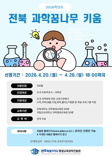 이번 사업은 진흥원이 전북대학교 과학영재교육원 및 국립군산대학교 과학영재교육원과 협력하여 운영하며, 도내 초등학생 4~6학년 100명(전북대 50명, 군산대 50명)을 선발해 대학의 우수한 인프라를 활용한 과학·수학 전문교육을 제공할 예정이다.