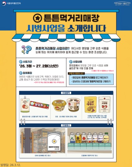한편, ‘튼튼먹거리 매장’ 위치는 식품안전나라 누리집 내 ‘우리동네 식품안전정보’ 지도에서 확인할 수 있다.