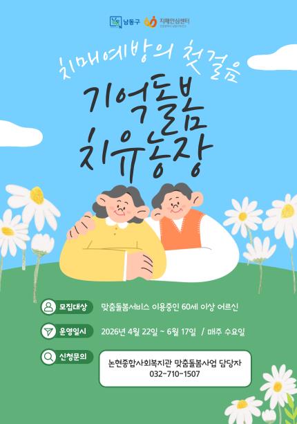 ![]() 남동구보건소, 치매 고위험 어르신 위한 ‘기억돌봄 치유농장’ 본격 가동 |