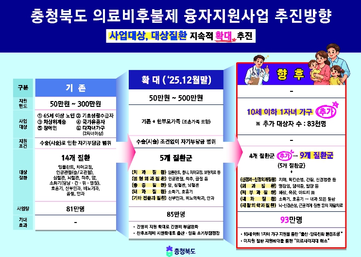 충청북도는 여기에서 더 나아가 지원 대상을 10세 이하 자녀를 둔 한 자녀 가정까지 확대하고, 신경과·외과·피부과·재활의학과 등 4개 질환군을 추가해 기존 5개 질환군에서 총 9개 질환군으로 확대할 계획이다. 이를 통해 보다 촘촘하고 빈틈없는 지원체계를 구축한다는 방침이다.