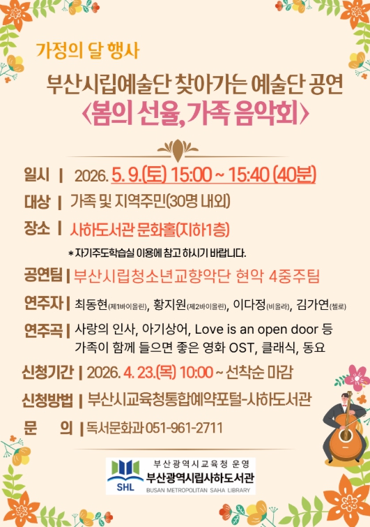 음악회는 부산시립예술단 ‘찾아가는 예술단’ 사업의 일환으로 진행되며, 부산시립청소년교향악단 현악 4중주팀이 무대를 꾸민다. ‘사랑의 인사’, ‘Love is an open door’ 등 영화 OST, 클래식, 동요 등 다양한 장르의 곡을 연주해 어린이부터 성인까지 온 가족이 함께 즐길 수 있는 공연으로 운영한다.