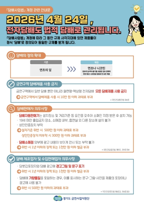 이번 점검은 2026년 4월 24일부터 시행되는 '담배사업법' 개정에 따른 조치로, 액상형 전자담배 등 신종 담배 제품이 처음으로 본격적인 법적 관리 대상에 포함되면서 점검 범위가 크게 확대됐다.