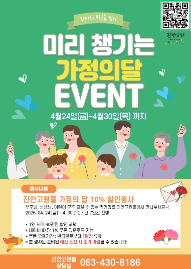 ![]() 진안군 공식 온라인 쇼핑몰 ‘진안고원몰’ 가정의 달 맞이 ‘전 품목 10%’ 할인 행사 진행 |
