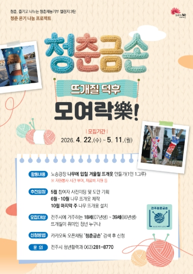 오태영 전주시 청년활력과장은 “청년들이 제작한 뜨개옷은 단순한 뜨개 작품이 아니라 지역사회에게 전하는 따뜻한 온기가 될 것”이라며 “나만의 개성이 담긴 뜨개질로 노송광장 나무들을 예술 작품으로 재탄생시킬 이번 프로젝트에 많은 관심과 참여를 바란다”고 말했다.