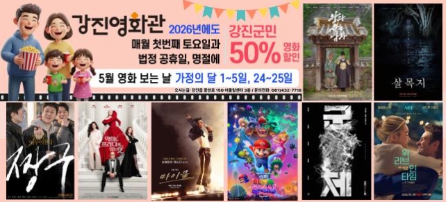 이번 5월 행사를 통해 강진영화관이 온 가족이 함께 즐기는 생활 밀착형 문화 공간으로서의 의미를 더할 것으로 보인다.