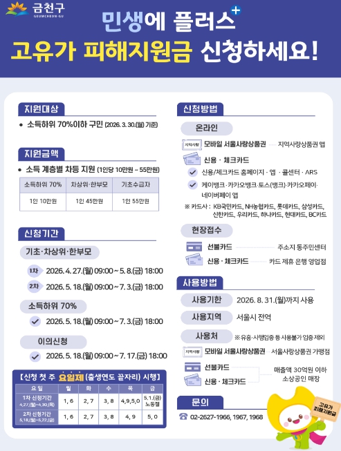 취약계층을 대상으로 한 1차 고유가 피해지원금 지급에 이어 일반 구민(소득 하위 70%)을 대상으로 하는 2차 고유가 피해지원금은 오는 5월 18일부터 지급될 예정이다. 구는 행정안전부의 대상자 명단이 확정되는 대로 세부 지급 계획을 별도로 안내할 계획이다.