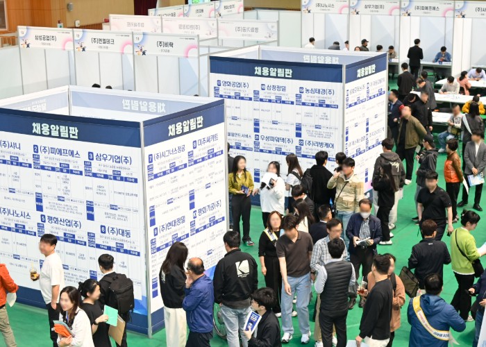 ![]() 22일 달성군민체육관에서 개최된 ‘2026년 제1차 달성군 취업박람회’ 현장. 채용 알림판 앞이 구직자들로 가득 차 발 디딜 틈이 없다 |